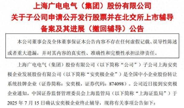 在启动IPO一年半后,广电电气宣布,子公司安奕极于7月15日确认终止辅导。